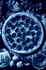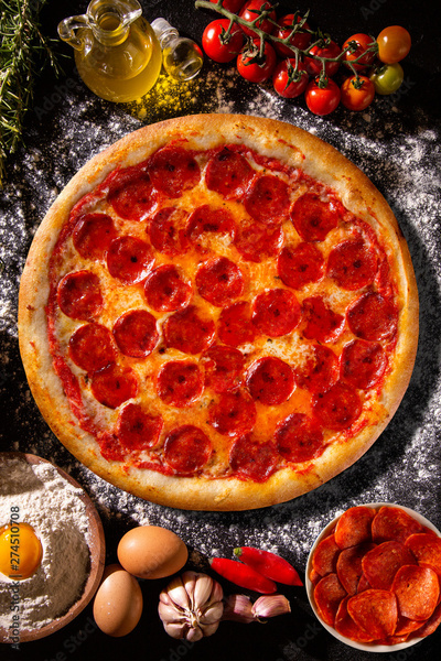 Pizza pepperoni on black concrete background. Top view, close up. Traditional Brazilian Pizza