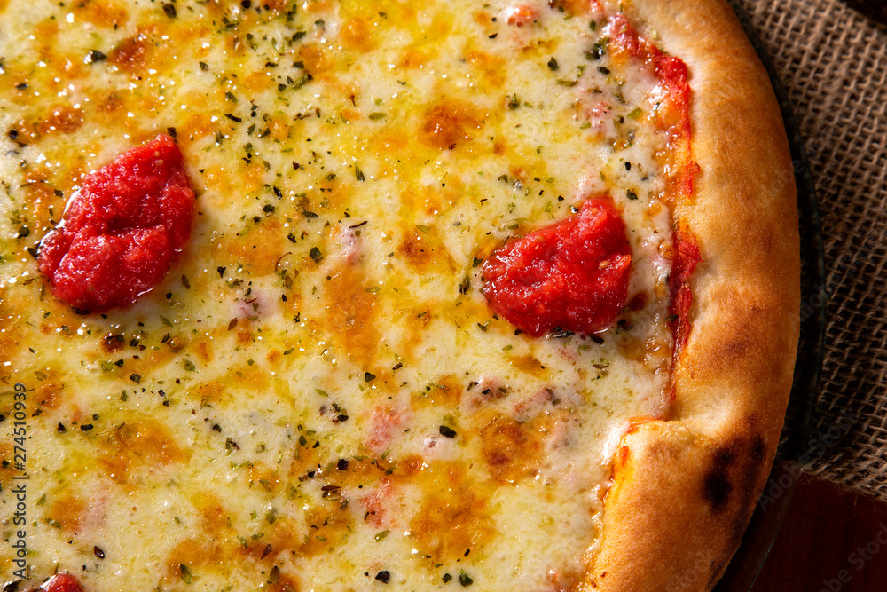 Pizza Margherita on wood background, top view. Pizza Margarita with Tomatoes, Basil and Mozzarella Cheese close up. Traditional Brazilian Pizza.