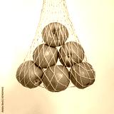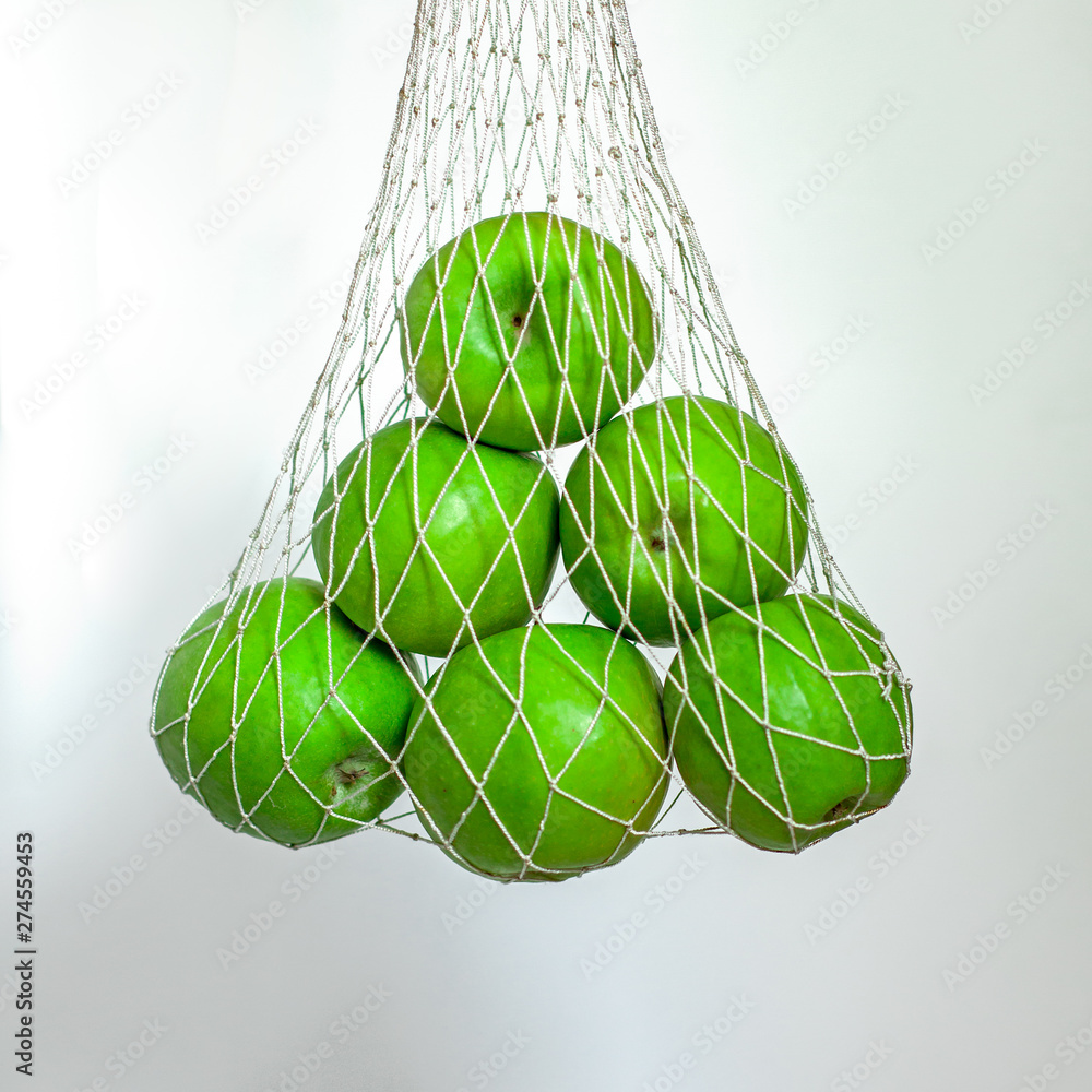 bright green apples in a shopping bag, ecological concept, six juicy apples are isolated on white background
