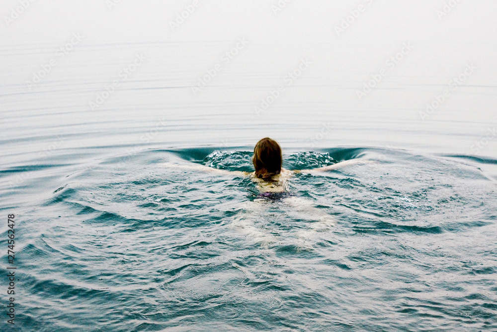 Young beautiful woman is swimming in calm water. The calm water of the lake.