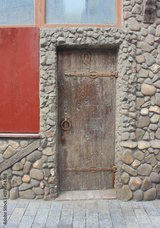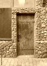 Old wooden door and stoned arch at abandoned aged medieval building facade