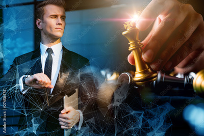 caucasian businessman investor with golden chess board game strategy ideas concept