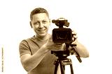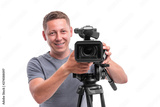 Cameraman. Video camera operator isolated on a white background.