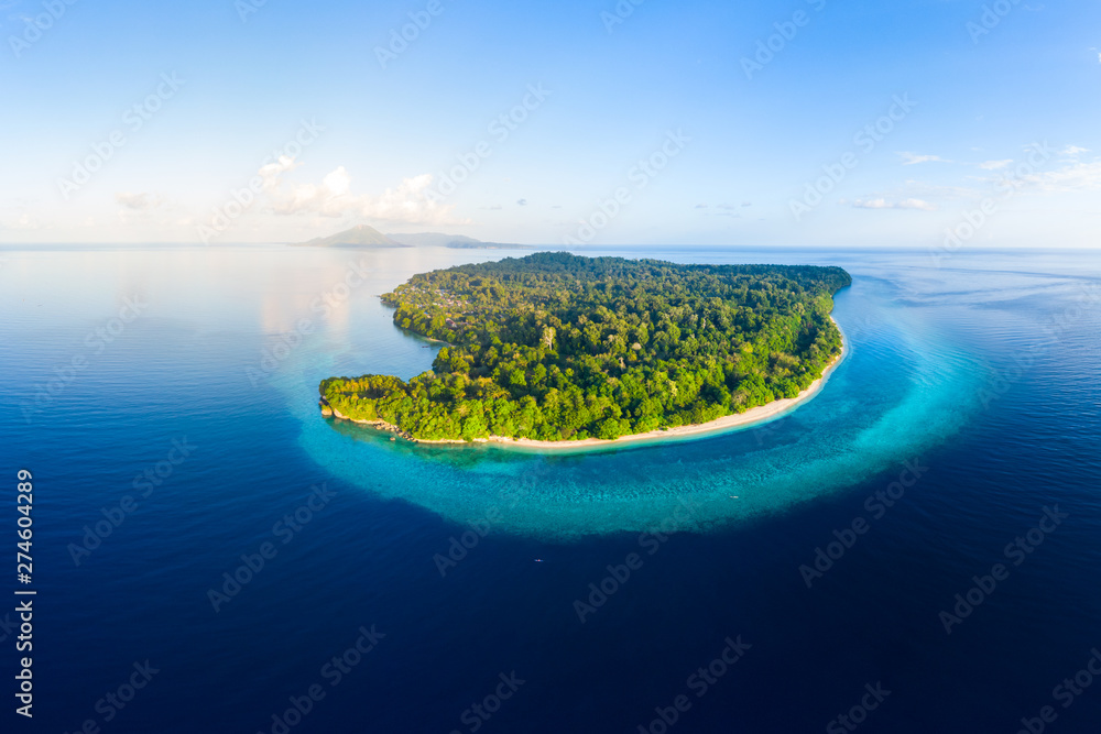 Aerial view tropical beach island reef caribbean sea. Indonesia Moluccas archipelago, Banda Islands, Pulau Ay. Top travel tourist destination, best diving snorkeling.