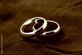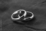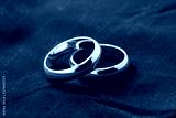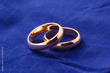 Gold wedding rings. Two engagement rings close up on blue velvet background, macro jewelry for newlyweds.