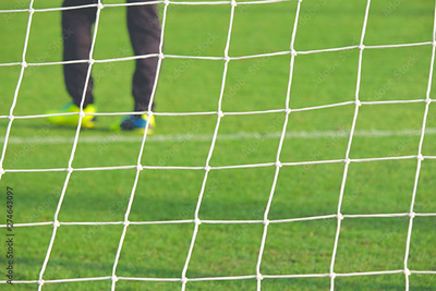 Football soccer goal net in focus with some players having training.