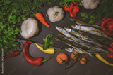 Smoked Fish and vegetables Top down food photo