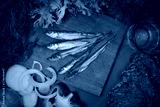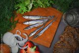 Smoked Fish and vegetables Top down food photo