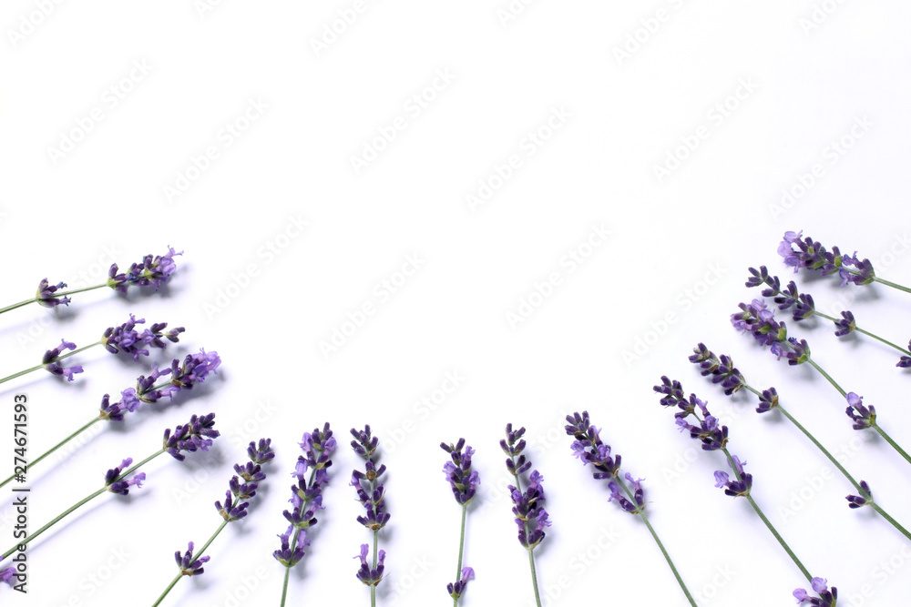 The sprigs of flowering lavender are located in a semicircle on a light background top view. a place for gentle wishes
