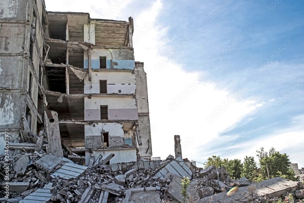 The remains of the destroyed concrete building against the textured blue sky. Space for text. Background