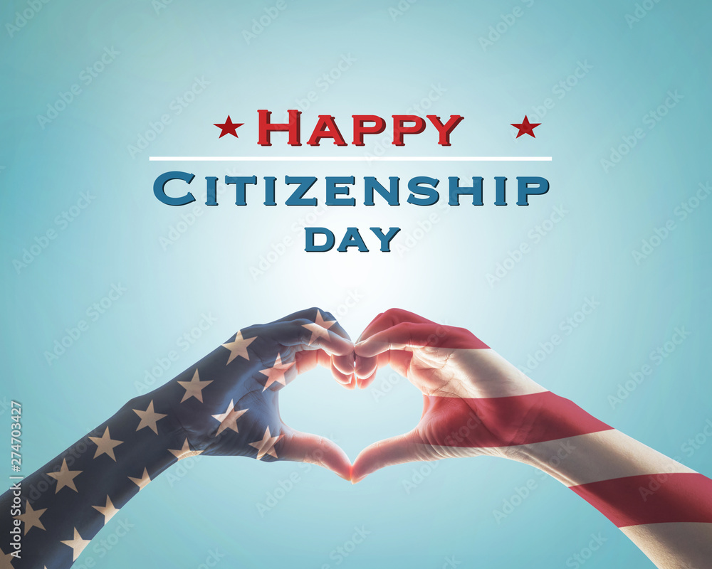 Happy citizenship day with American flag pattern on people hands in heart shape