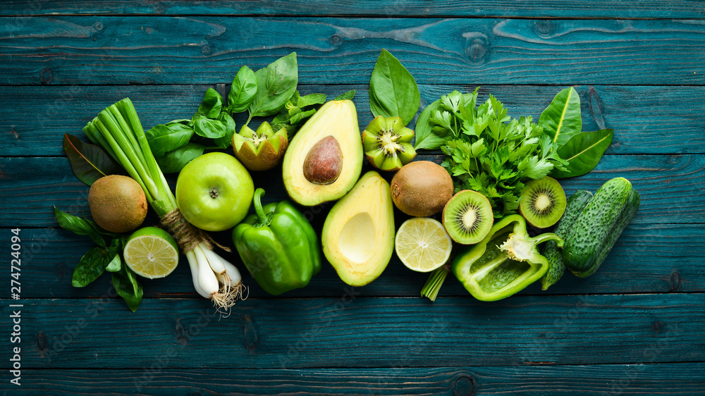 Healthy Green food. Fruits and vegetables - avocado, lime, onion, apple, kiwi, spirulina. On a blue wooden background. Top view. Free space for your text.