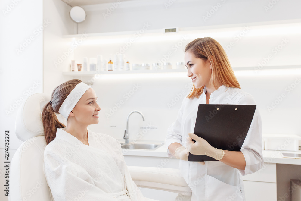 Young pretty woman came to a beauty salon and consults with a beautician on anti-aging treatments. Self care concept
