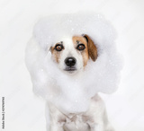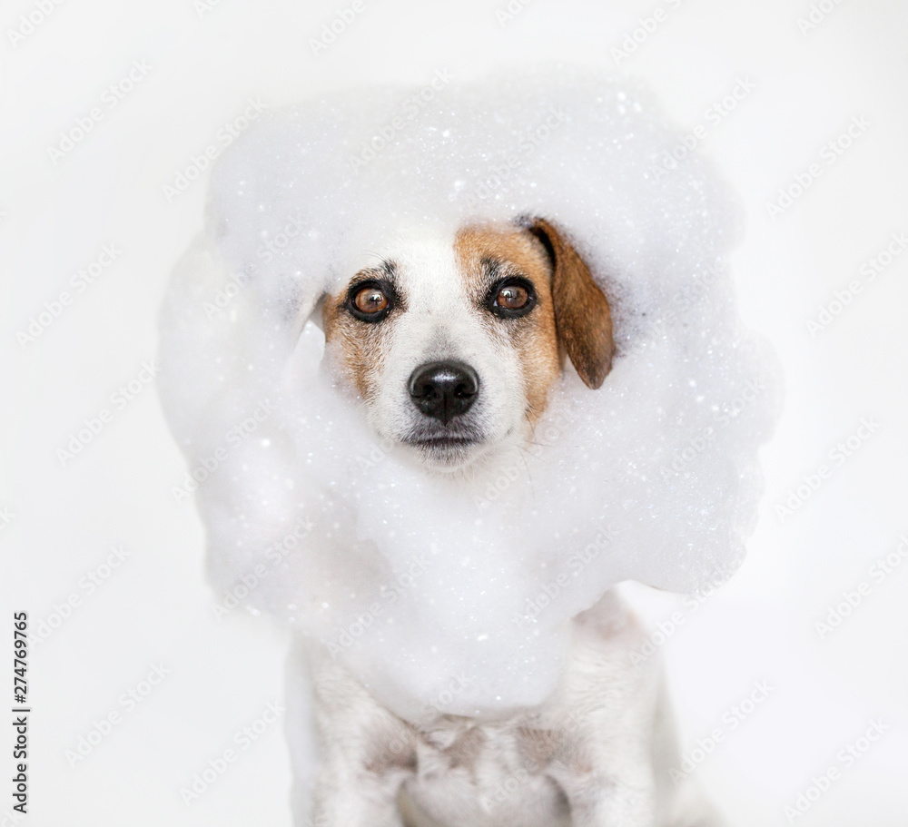 Dog washes with soap in bath
