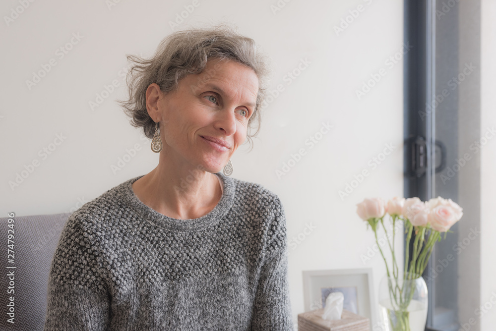 Closeup of middle aged woman seated in living room (soft filter effect and selective focus)