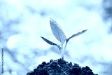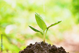 Young plant in the morning light on nature background, red ant on leaf