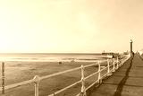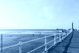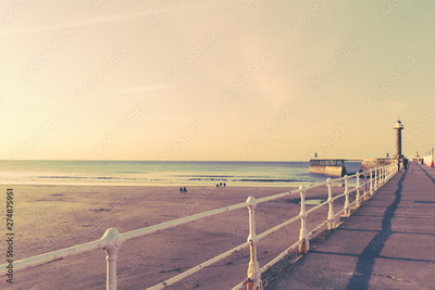 WHITBY, ENGLAND Tourists visiting Whitby Pier and lighthouse in May