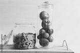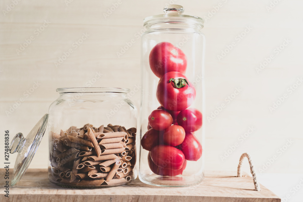 Still life, fresh tomatoes and pasta in glass jars