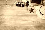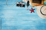 Accessories for travel top view on blue wooden background with copy space. Adventure and wanderlust concept image with travel accessories. Preparing for an exotic trip, journey and sightseeing.