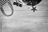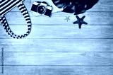 Accessories for travel top view on blue wooden background with copy space. Adventure and wanderlust concept image with travel accessories. Preparing for an exotic trip, journey and sightseeing.