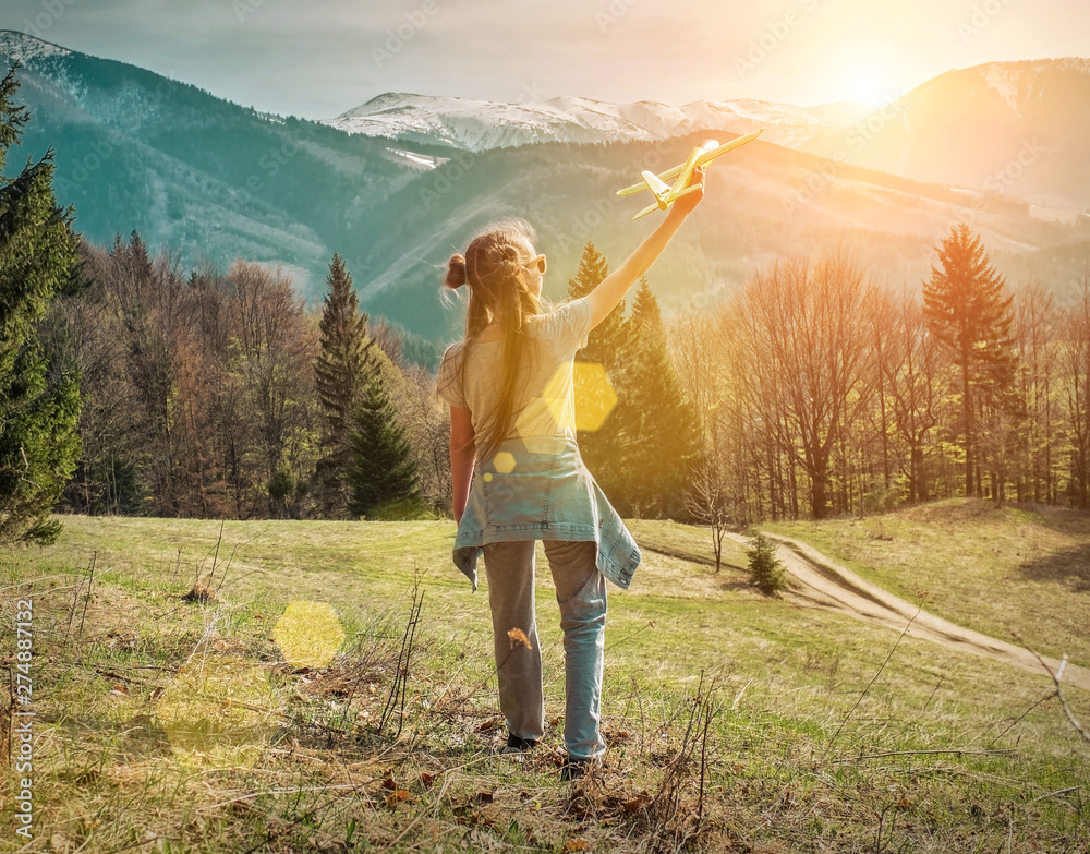 Young aviator girl with her airplane toy starting fly. Beautiful