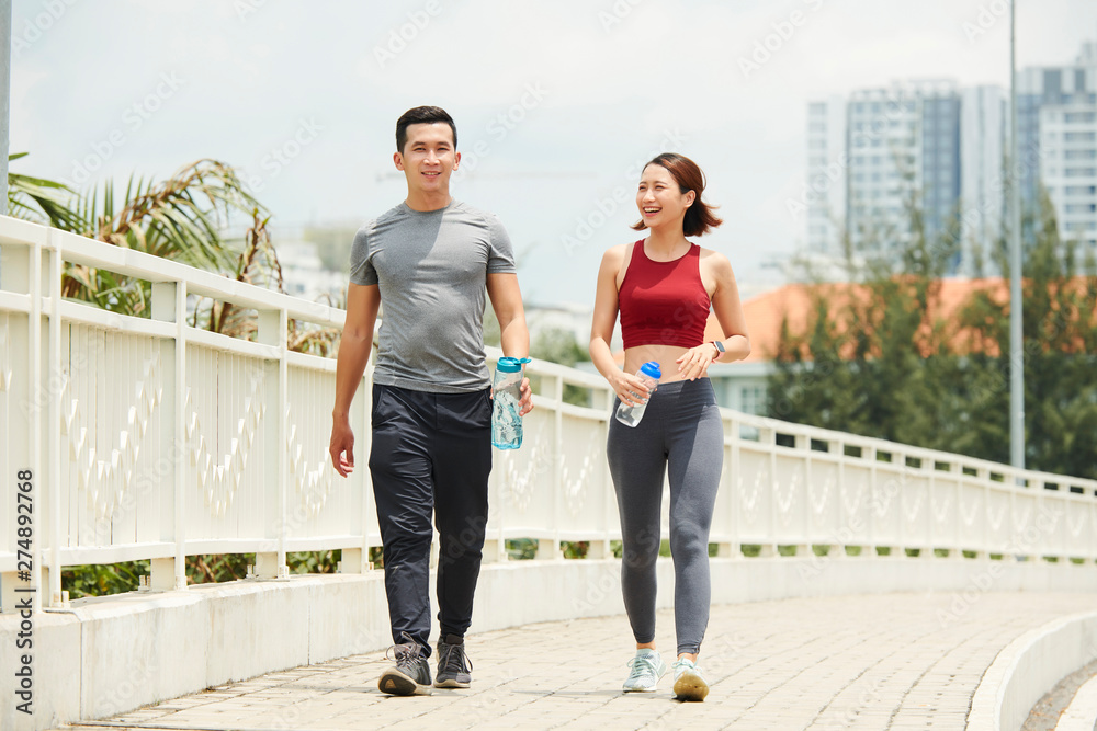 Fit smiling Asian man and woman walking on bridge with water bottles after morning run