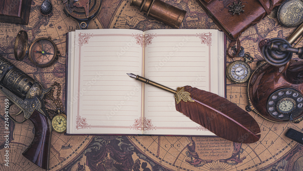 Pen Quill On Diary Book With Vintage Item
