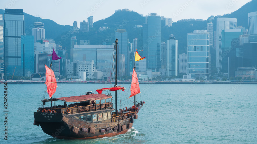 Traditional Junk Boat At Victoria Harbour In Hong Kong On October 9, 2018