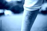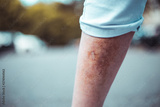 Young person wearing white shorts with a bruised leg with a grey blurred background – Small and painful injury caused by minor accidents