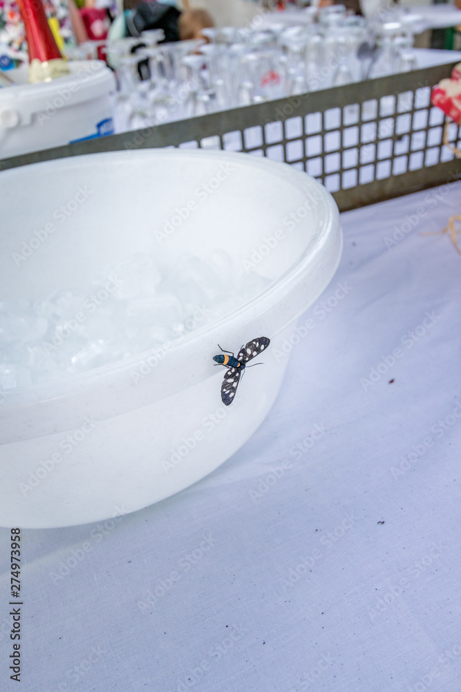 Schmetterling Weißfleck Widderchen an weißer Schüssel mit Eiswürfeln