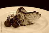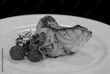 grilled fillet of white fish with cherry tomato in a white ceramic plate