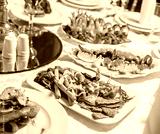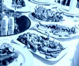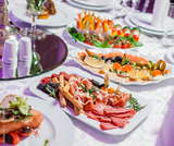Wedding table served with tasty meals, antipasto platter cold meat, fish platter, cheese platter. Holiday banquet menu. Appetizer, catering food concept
