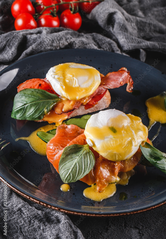 Healthy breakfast sandwiches. Bread toasts with Poached eggs or eggs Benedict, fresh vegetables, avocado, fillet salmon, bacon on dark background. Clean eating, healthy food, diet, top view
