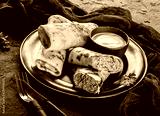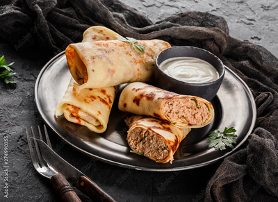Crepes with chopped meat, greens and sour cream on black plate over dark background. Pancake week or Shrovetide. Healthy breakfast. Top view, flat lay