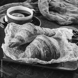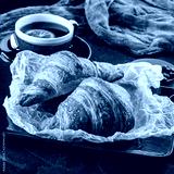 Breakfast with fresh french chocolate croissants on paper over dark background with napkin and cup of tea. Dessert, puff pastries, top view