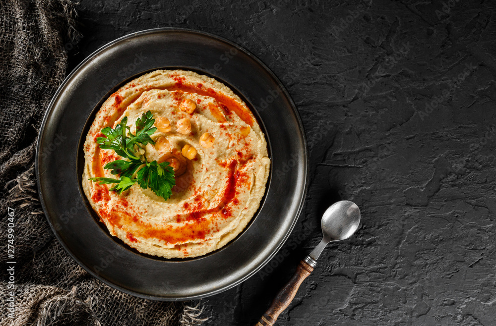 Chickpeas hummus with olive oil, paprika in a plate over dark stone background. Healthy vegan food, clean eating, dieting, top view