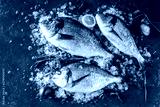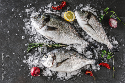 Fresh raw dorado fishes with spices, lemon, pepper, rosemary on ice over dark stone background. Creative layout made of fish, top view, flat lay
