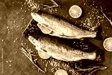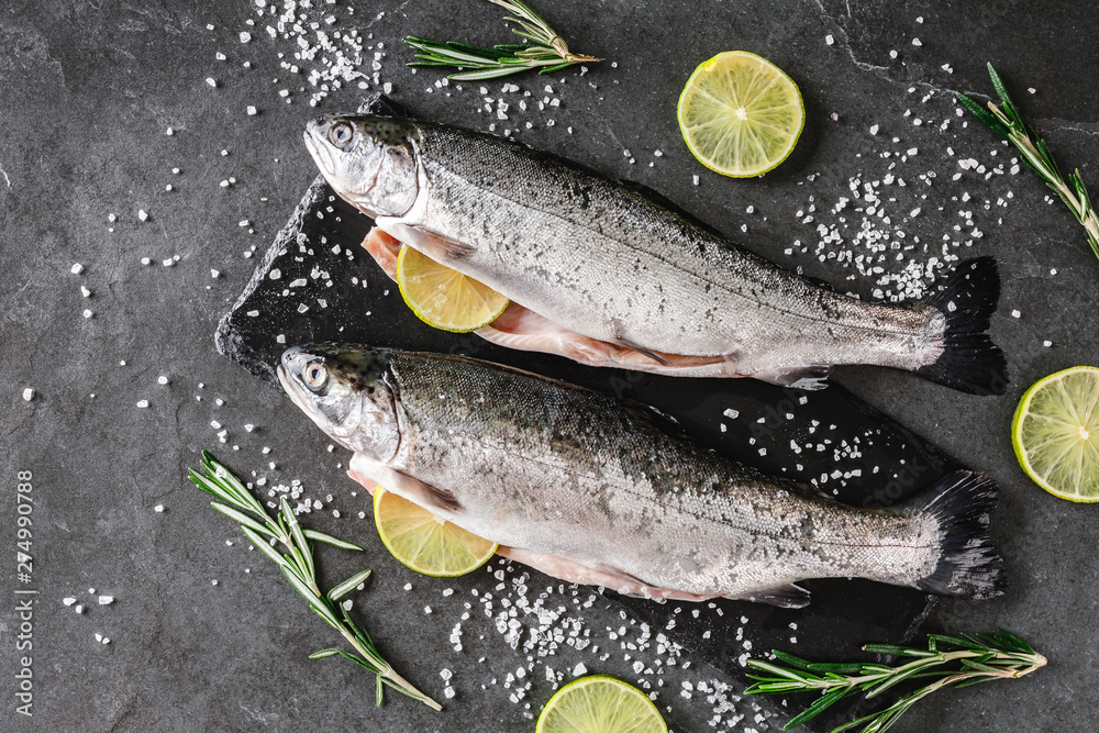 Fresh raw trout fishes with spices, lemon, rosemary on dark stone background. Creative layout made of fish, top view, flat lay