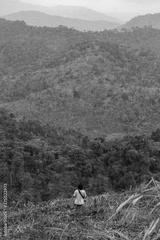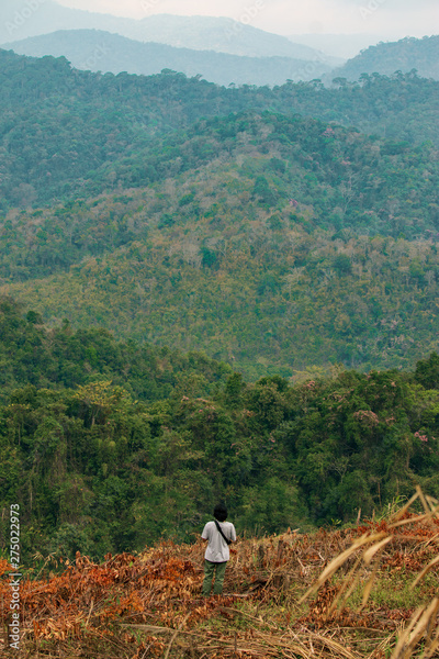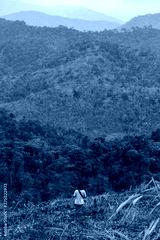 Deforestation concept image consisting of an unrecognizable man walking among felled trees in a forestry.