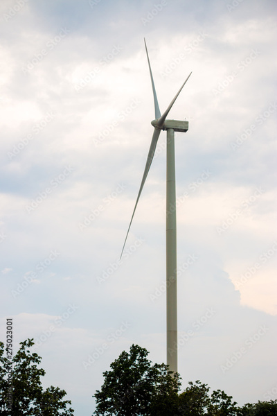 Wind turbine farm power generator in beautiful nature landscape for production of renewable green energy is friendly industry to environment.