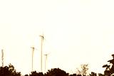 Wind turbine farm power generator in beautiful nature landscape for production of renewable green energy is friendly industry to environment.