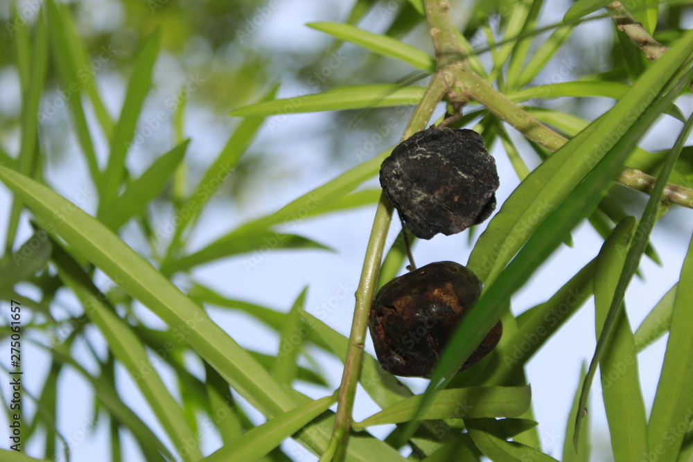 Close up ripe dry Cascabela thevetia fruit,Thevetia peruviana is poisonous plant cultivated as an ornamental.is relative of Nerium oleander,lucky nut in West Indies.also known kaner/kaniara in India.