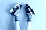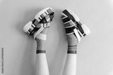 Beautiful female legs in mismatched trendy socks posing in two different fashionable high wedge leather sandals on gray background. Odd disargonized young girl wearing high sole summer stylish shoes.
