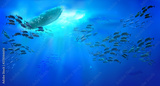 Small fishing boat in the ocean. Shoal of fish. Underwater view.