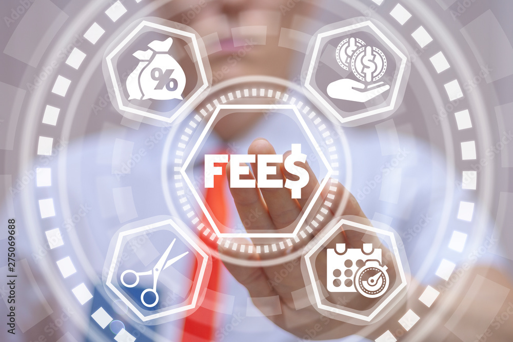 Fee and Fees Financial Technology. Man working on virtual screen of future and touches icon: fees with dollar. Business hidden money, banking and tax concept.