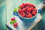 Fresh organic raspberries on the blue wooden background