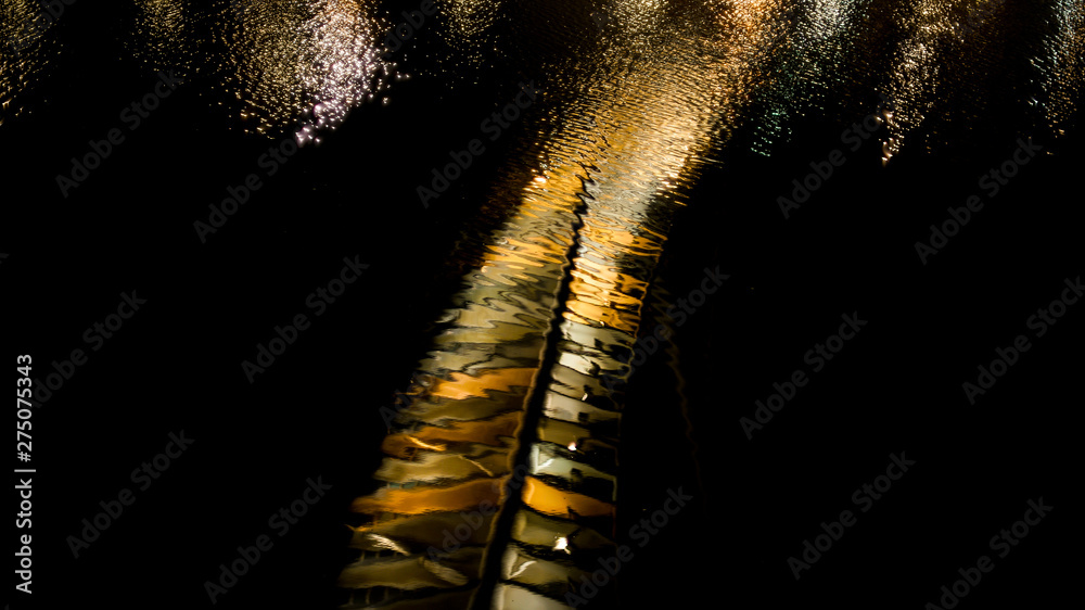 Creative reflections of a bridge on the water. Beautiful lights, flares, bokeh and colour. Colour on the water, abstract texture of reflected light. Dark water, artistic view.