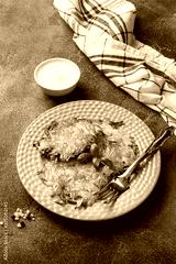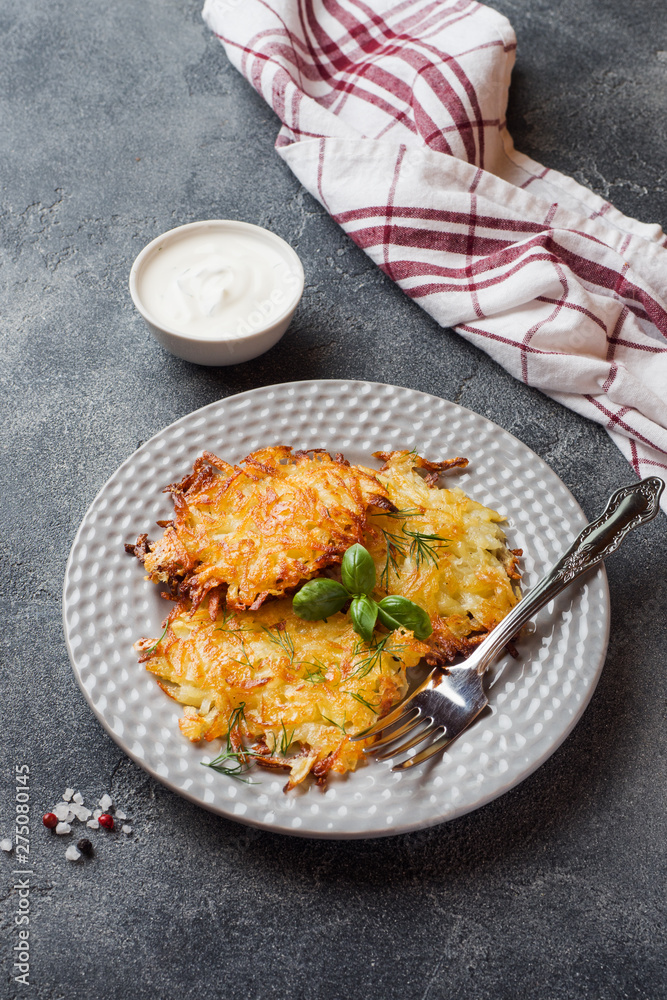 Fried cakes of grated potatoes on the plate with sauce. Traditional pancakes boxty raggmunk