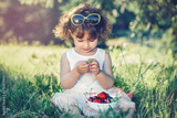 Cute adorable Caucasian toddler baby girl sitting on grass and eating berries fruits. Funny child with sunglasses in park having healthy snack meal. Summer delicious tasty finger food for kids.