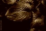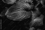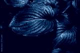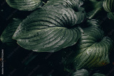 Dark nature background of big Hosta leaves with small rain drops on them in low light conditions – Lush garden or park vegetation in spring after a heavy rain